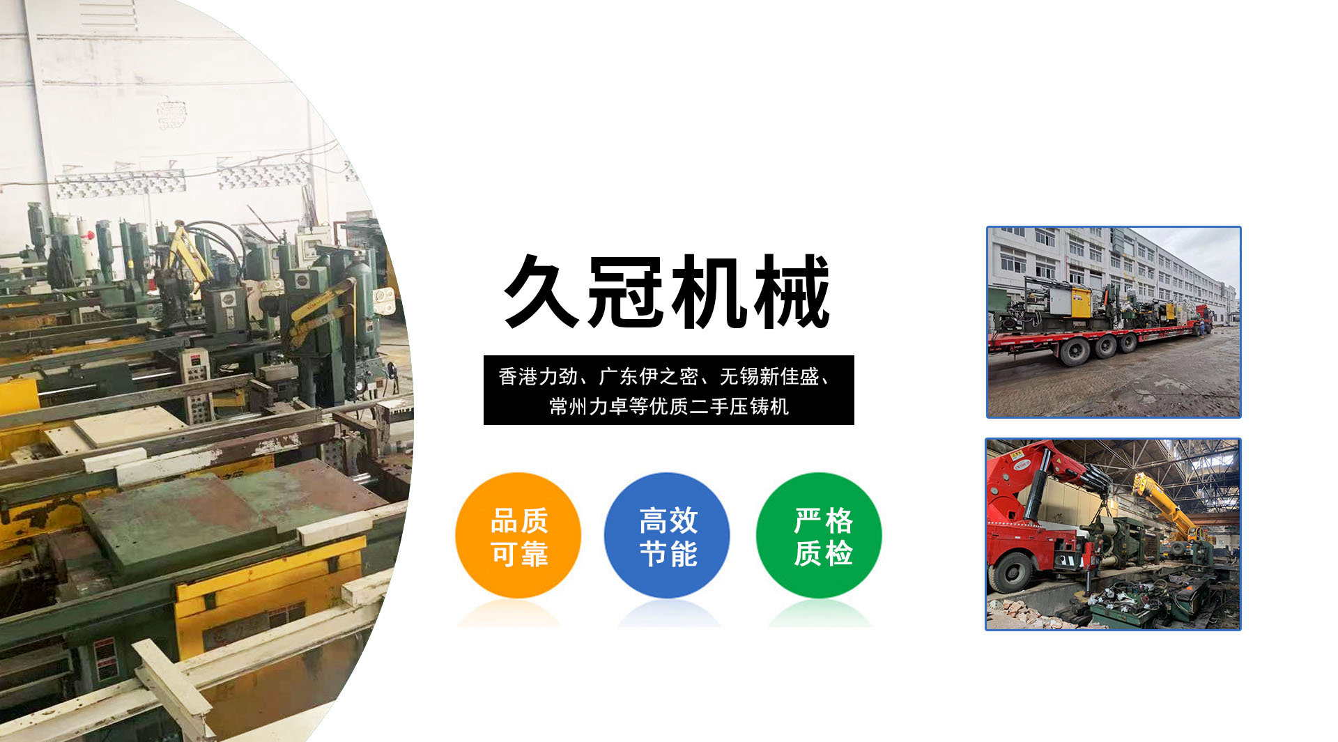 ? ? ? ?臺州久冠機械科技有限公司位于浙江省臺州市路橋區峰江鎮峰江路一號 ,專業從事二手壓鑄機及周邊設備業務,專營國內知名品牌,如香港力勁,廣東伊之密,無錫新佳盛,常州力卓等優質二手壓鑄機,為國內外鑄造產業鏈用戶提供優質可靠的二手壓鑄機。公司發展與壯大二十年來,我們一直秉承團結協作,互惠互利,誠實守信,質優價廉的原則和理念持續為客戶提供優質貨源,自公司成立以來,有在線專家服務,并參加國內外壓鑄機展會,現二手壓鑄機國際店鋪已搭建成型,歡迎國內各位新老朋友前來咨詢選購!